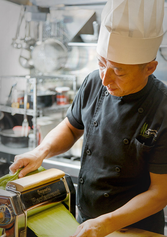 1998年に渡伊しローマで修業した後、トスカーナ州のレストランにて料理の師であるシェフ(サルヴァトーレ氏)に出会い、高い技術や料理に対する姿勢を学ぶ。